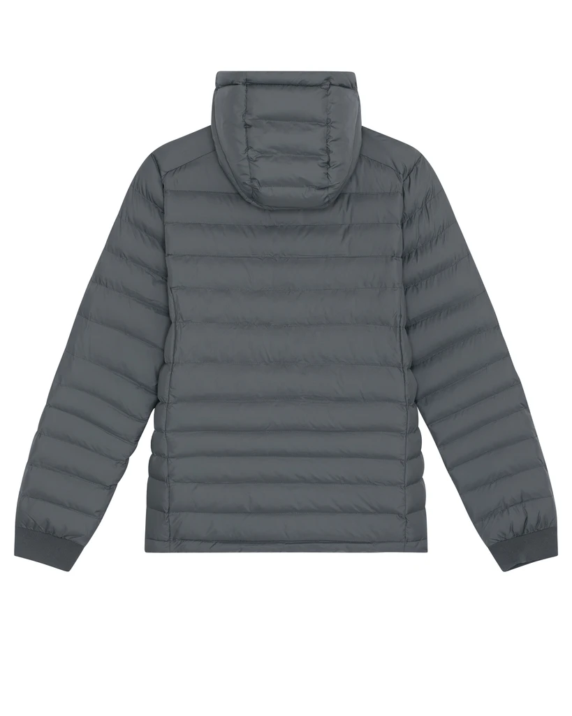 Material: 100 % recyceltes Polyester, fluorfreie DWR; Gewicht: 75g/m²; Taillierter Schnitt, angesetzte Ärmel, hoher Kragen mit abnehmbarer Kapuze und verdeckten Druckknöpfen aus mattem Metall, Kapuzenöffnung und unterer Saum mit verstellbarem Kunststoffstopper und elastischer Kordel, umgekehrter Nylonreißverschluss vorne in der Mitte, Leistentaschen mit Reißverschluss und zusätzlichem Ripsbandschieber, vollständig gesteppt, Seiteneinsätze für bessere Form, 1x1-Ripp am Ärmelsaum, innen eingefasste Nähte; Zertifikate: Global Recycled Standard (GRS), Fair Wair, STANDARD 100 by OEKO-TEX®, Peta - Approved VEGAN