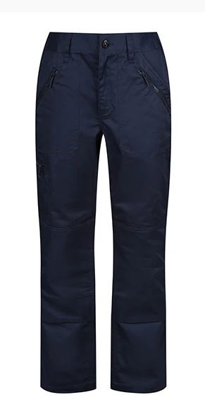Teilelastischer Bund mit Gürtelschlaufen, Metallknopf- und Reißverschlussschlitz, verstärkte Schrittnaht, 2 RV-Fronttaschen, 1 mit kleiner Münztasche, 2 Gesäßtaschen, 1 seitliche RV-Tasche, verstärkte Nähte mit Dreifachnähten