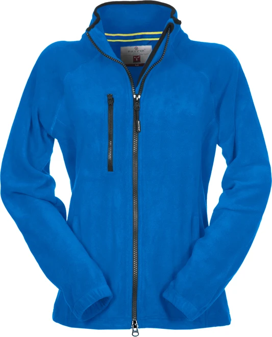 Taillierte Damen-Fleecejacke mit durchgehendem, schwarzem 8 mm Reißverschluss aus Kunststoff, Raglanärmeln, regulierbarem Kordelzug in der Taille, elastischen Ärmelbündchen, zwei Taschen mit verdecktem Reißverschluss, einer Vordertasche mit Reißverschluss, Kragen mit verstärktem Rand in Kontrastfarbe, verstärkten Nähten