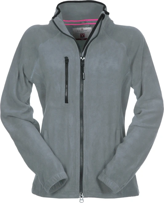 Taillierte Damen-Fleecejacke mit durchgehendem, schwarzem 8 mm Reißverschluss aus Kunststoff, Raglanärmeln, regulierbarem Kordelzug in der Taille, elastischen Ärmelbündchen, zwei Taschen mit verdecktem Reißverschluss, einer Vordertasche mit Reißverschluss, Kragen mit verstärktem Rand in Kontrastfarbe, verstärkten Nähten