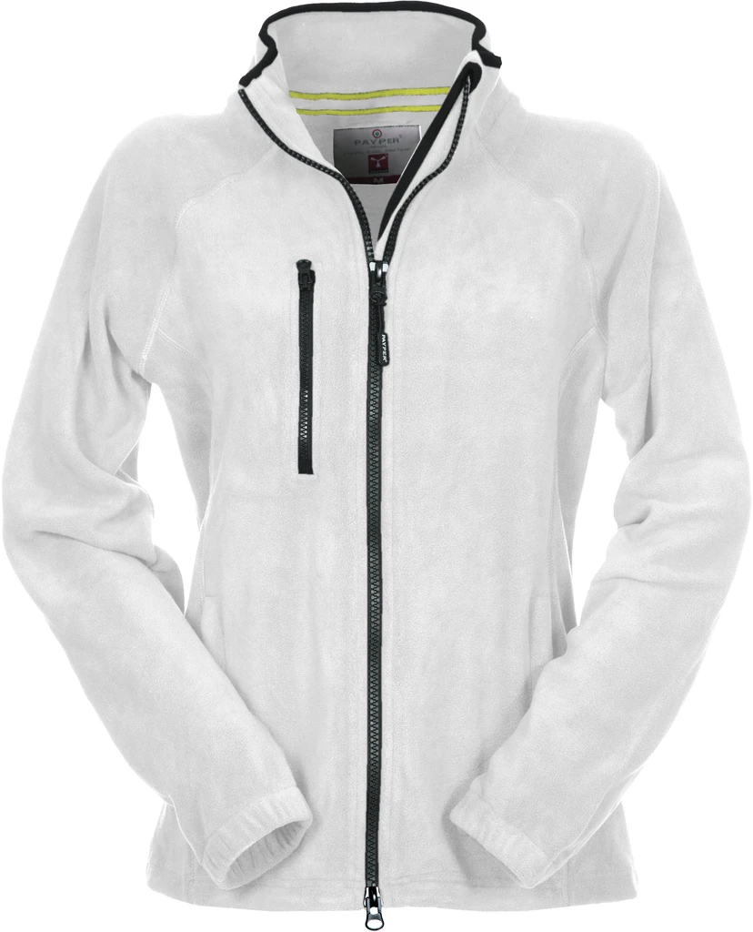 Taillierte Damen-Fleecejacke mit durchgehendem, schwarzem 8 mm Reißverschluss aus Kunststoff, Raglanärmeln, regulierbarem Kordelzug in der Taille, elastischen Ärmelbündchen, zwei Taschen mit verdecktem Reißverschluss, einer Vordertasche mit Reißverschluss, Kragen mit verstärktem Rand in Kontrastfarbe, verstärkten Nähten