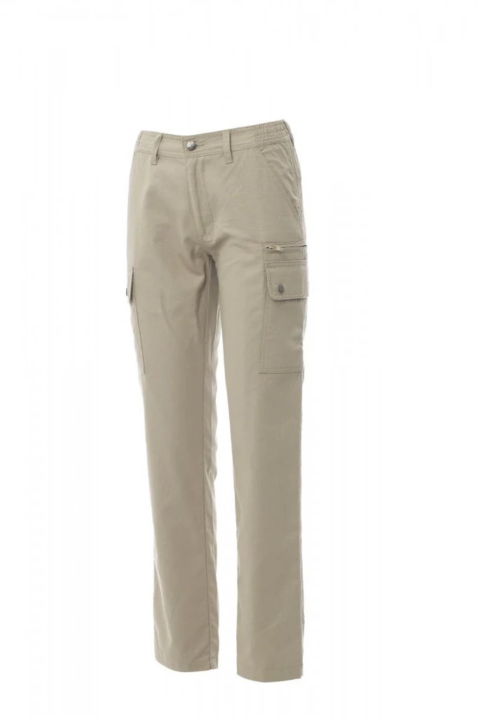 Ganzjährig tragbare Damenhose im klassischen Schnitt mit seitlich dehnbarem Bund und Gürtelschlaufen, Hosenschlitz mit Metallreißverschluss und -knopf, zwei klassisch geschnittenen Vordertaschen, zwei Seitentaschen mit Patte und Druckknöpfen, einer Reißverschlusstasche links, einer Einstecktasche für den Zollstock rechts, zwei Gesäß-Leistentaschen mit Knopf und Knopfloch