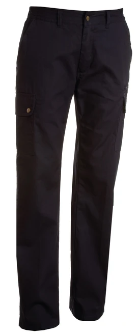 Ganzjährig tragbare Damenhose im klassischen Schnitt mit seitlich dehnbarem Bund und Gürtelschlaufen, Hosenschlitz mit Metallreißverschluss und -knopf, zwei klassisch geschnittenen Vordertaschen, zwei Seitentaschen mit Patte und Druckknöpfen, einer Reißverschlusstasche links, einer Einstecktasche für den Zollstock rechts, zwei Gesäß-Leistentaschen mit Knopf und Knopfloch