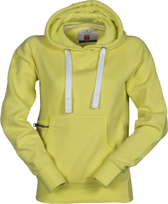 Tailliertes Damen-Sweatshirt mit Kapuze mit zwei Nähten und weißem Kordelzug, Nähten Ton-in-Ton und Metallösen, Raglanärmeln, V-Ziernaht am Ausschnitt, Kängurutaschen, Reißverschlusstäschchen,
