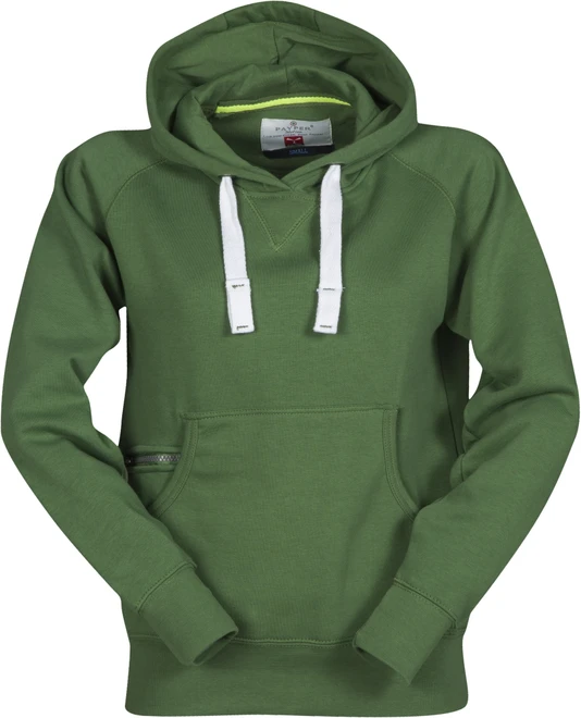 Tailliertes Damen-Sweatshirt mit Kapuze mit zwei Nähten und weißem Kordelzug, Nähten Ton-in-Ton und Metallösen, Raglanärmeln, V-Ziernaht am Ausschnitt, Kängurutaschen, Reißverschlusstäschchen,
