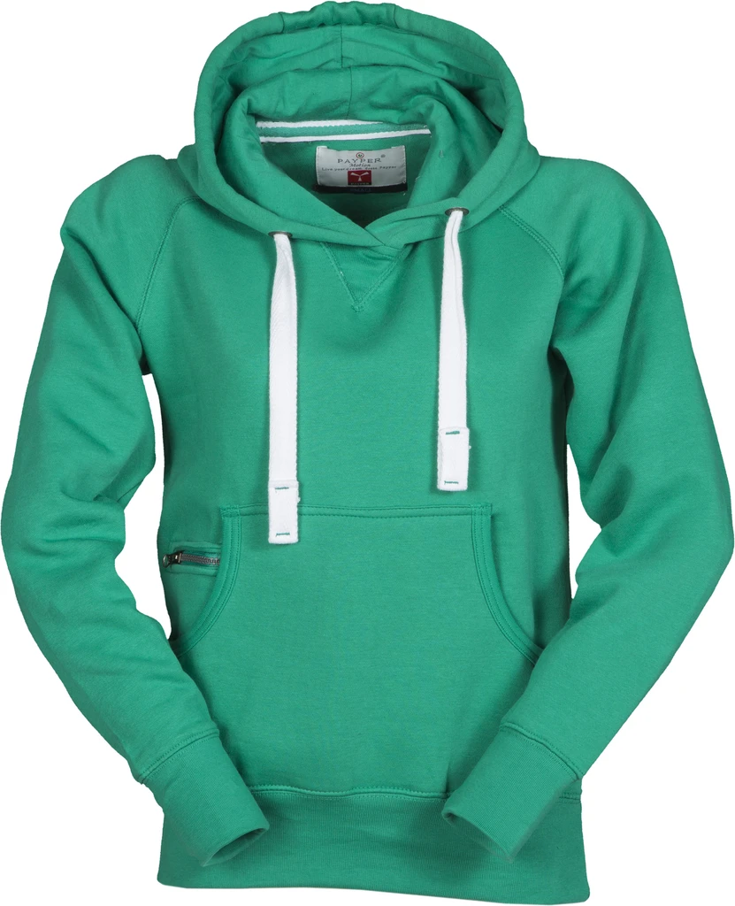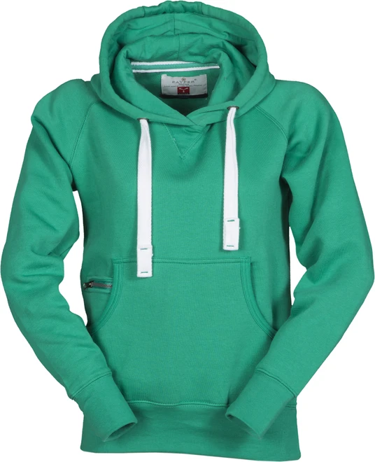Tailliertes Damen-Sweatshirt mit Kapuze mit zwei Nähten und weißem Kordelzug, Nähten Ton-in-Ton und Metallösen, Raglanärmeln, V-Ziernaht am Ausschnitt, Kängurutaschen, Reißverschlusstäschchen,