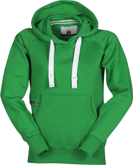 Tailliertes Damen-Sweatshirt mit Kapuze mit zwei Nähten und weißem Kordelzug, Nähten Ton-in-Ton und Metallösen, Raglanärmeln, V-Ziernaht am Ausschnitt, Kängurutaschen, Reißverschlusstäschchen,