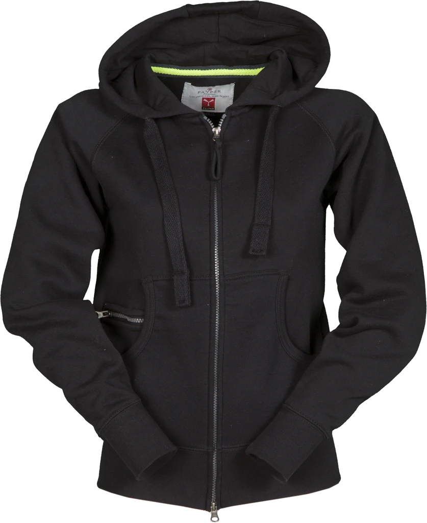 Taillierte Damen-Sweatjacke mit durchgehendem, verdecktem 2-Wege-SBS-Reißverschluss aus Kunststoff mit Metallschieber, Kapuze mit zwei Nähten und weißem Kordelzug, Nähten Ton-in-Ton und Metallösen, Raglanärmeln, Kängurutaschen mit Reißverschlusstäschchen, elastischem Feinripp an Ärmeln und Taille, verstärkten Nähten