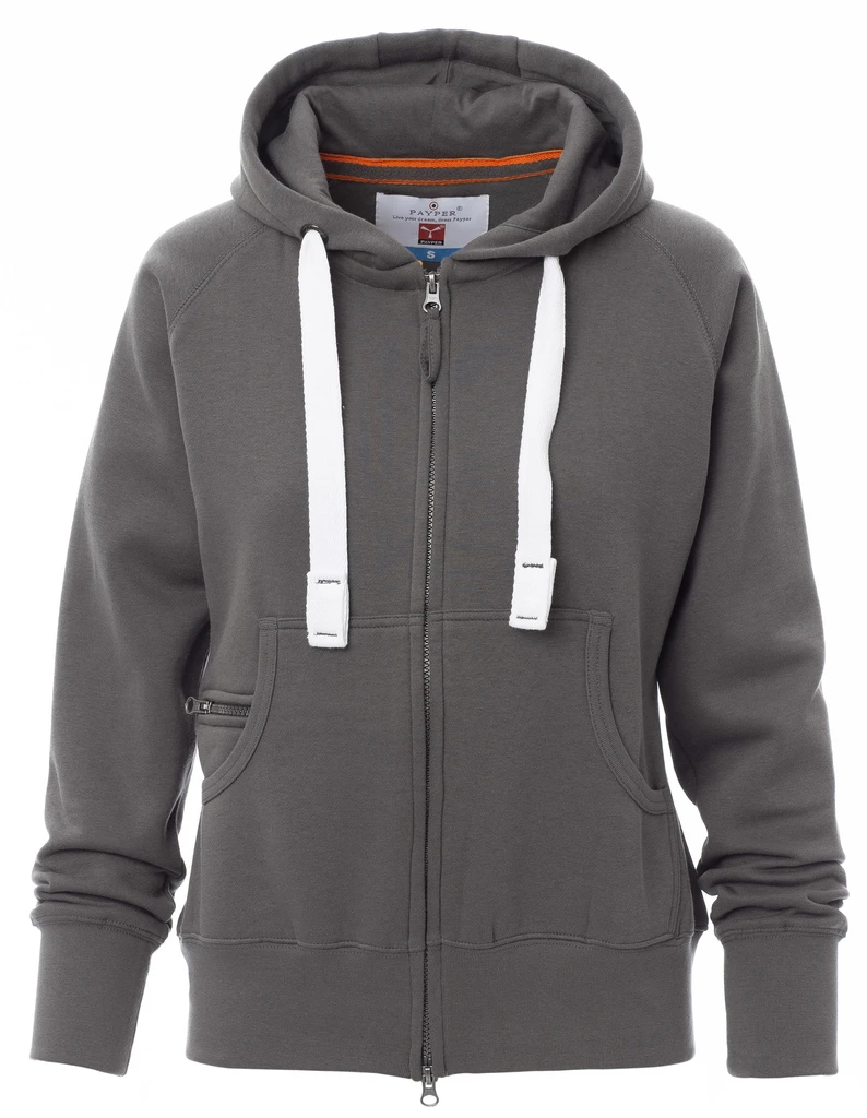 Taillierte Damen-Sweatjacke mit durchgehendem, verdecktem 2-Wege-SBS-Reißverschluss aus Kunststoff mit Metallschieber, Kapuze mit zwei Nähten und weißem Kordelzug, Nähten Ton-in-Ton und Metallösen, Raglanärmeln, Kängurutaschen mit Reißverschlusstäschchen, elastischem Feinripp an Ärmeln und Taille, verstärkten Nähten