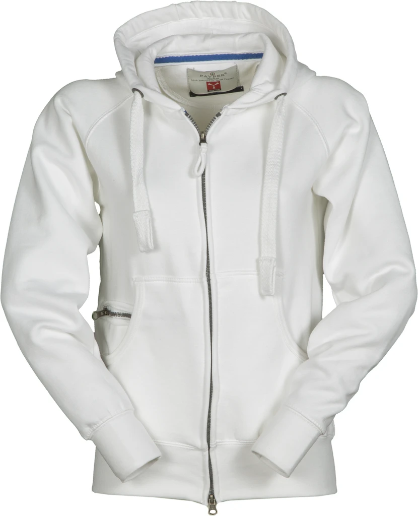 Taillierte Damen-Sweatjacke mit durchgehendem, verdecktem 2-Wege-SBS-Reißverschluss aus Kunststoff mit Metallschieber, Kapuze mit zwei Nähten und weißem Kordelzug, Nähten Ton-in-Ton und Metallösen, Raglanärmeln, Kängurutaschen mit Reißverschlusstäschchen, elastischem Feinripp an Ärmeln und Taille, verstärkten Nähten