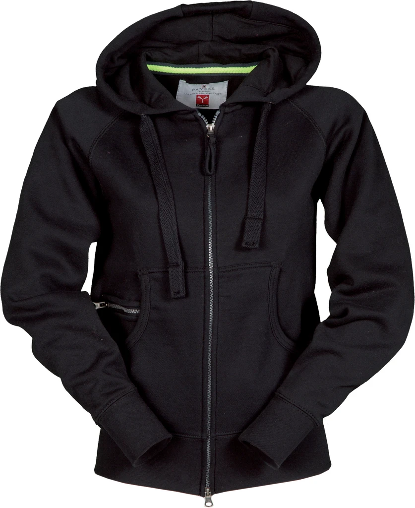 Taillierte Damen-Sweatjacke mit durchgehendem, verdecktem 2-Wege-SBS-Reißverschluss mit Metallschieber, Kapuze mit zwei Nähten und weißem Kordelzug, Nähten Tonin- Ton und Metallösen, Raglanärmeln, Kängurutaschen mit Reißverschlusstäschchen,