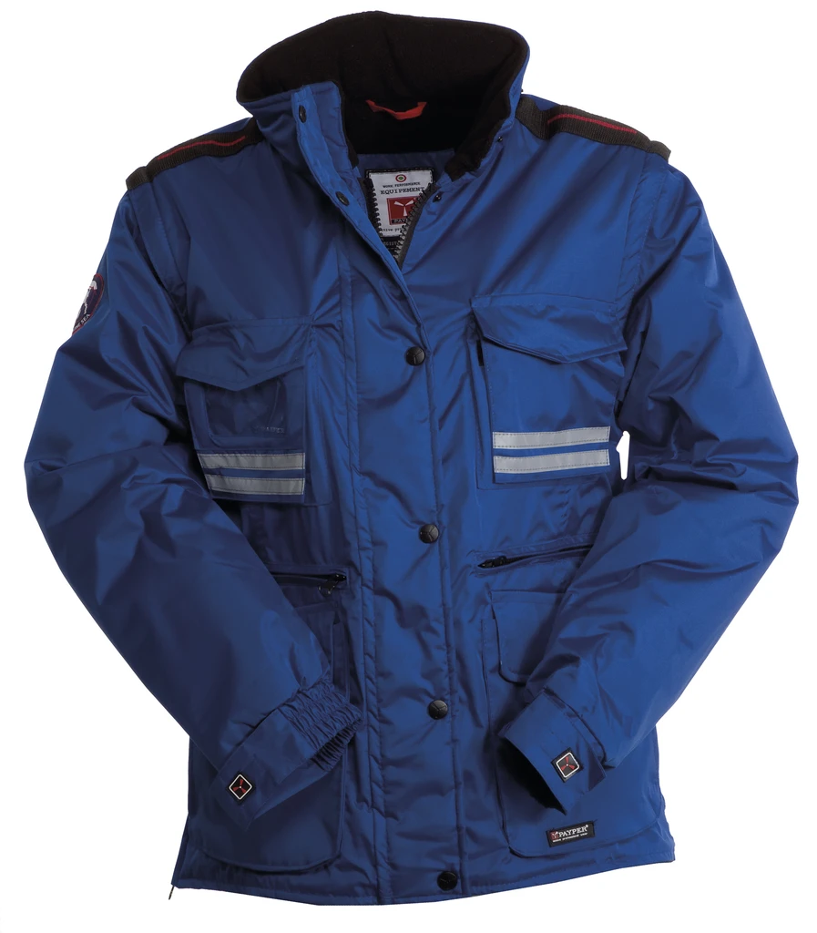 Kragen einrollbarer Kapuze, regulierbaren Ärmelbündchen, grauen Reflexstreifen vorne und hinten, vorgeformten Ellbogen und Seitenschlitz mit Ziehharmonikafalte und Reißverschluss, neun Außentaschen, davon zwei mit LOCK SYSTEM, zwei mit Reißverschluss und verstärkter Innenseite, einer mit nach innen wendbarem Ausweisfach; Innenseite: wattiert, Kragen, Rücken- und Nierenschutz aus Mikrofleece, atmungsaktive Einsätze, Kordelzug in der Taille und Innenreißverschluss zum einfacheren Veredeln mit Druck und