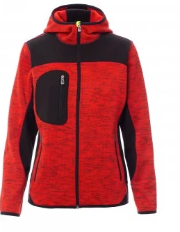 Taillierte Damen-Jacke mit langem versiegeltem SBS-Reißverschluss, vorgeformter Kapuze mit zwei Nähten, feinem Saum an Handgelenk und Taille, zwei Seitentaschen mit Reißverschluss, einer Brusttasche und schwarzen Strick- und Softshell-Einsätzen