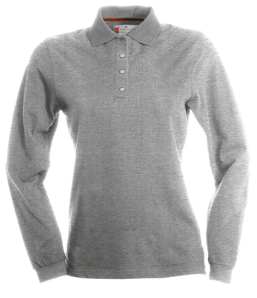 Tailliertes Damen-Polo-Shirt, langärmelig, mit 4 Knöpfen Ton-in-Ton mit Perlmutteffekt, Kragen und Ärmelrand aus Feinripp, Seitenschlitzen, Nackenband in Kontrastfarbe, Stretchnähten, seitlichem Verstärkungsband, Nackensattel