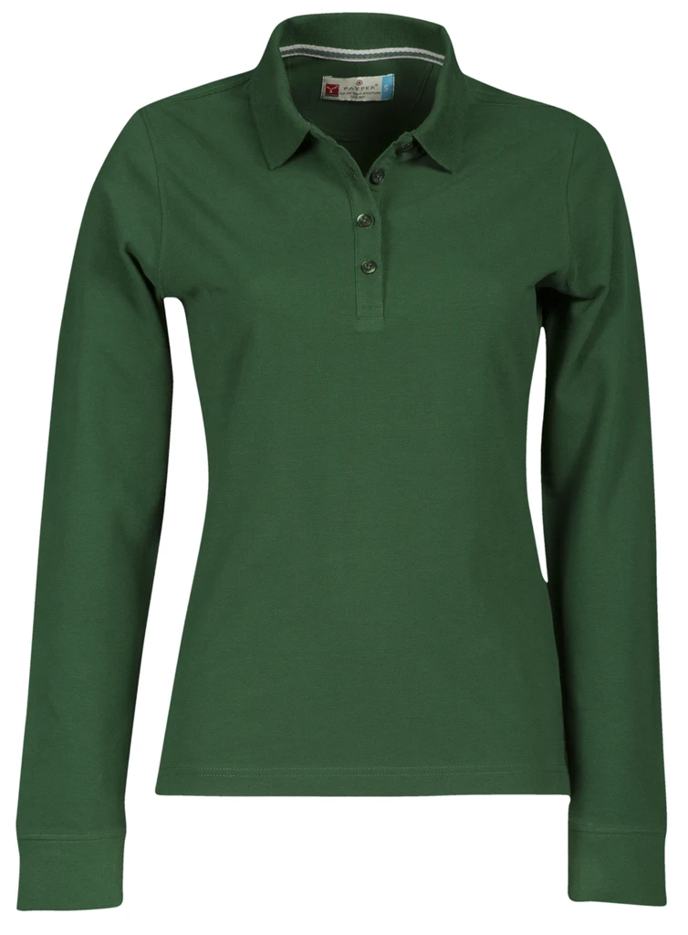 Tailliertes Damen-Polo-Shirt, langärmelig, mit 4 Knöpfen Ton-in-Ton mit Perlmutteffekt, Kragen und Ärmelrand aus Feinripp, Seitenschlitzen, Nackenband in Kontrastfarbe, Stretchnähten, seitlichem Verstärkungsband, Nackensattel
