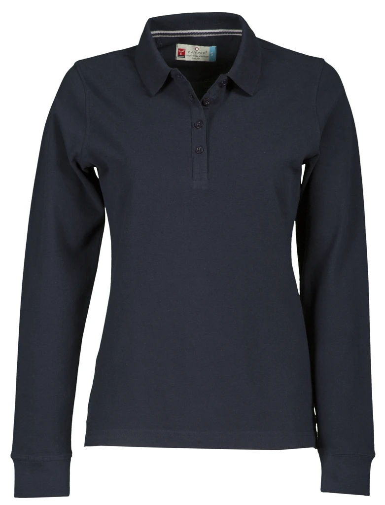 Tailliertes Damen-Polo-Shirt, langärmelig, mit 4 Knöpfen Ton-in-Ton mit Perlmutteffekt, Kragen und Ärmelrand aus Feinripp, Seitenschlitzen, Nackenband in Kontrastfarbe, Stretchnähten, seitlichem Verstärkungsband, Nackensattel