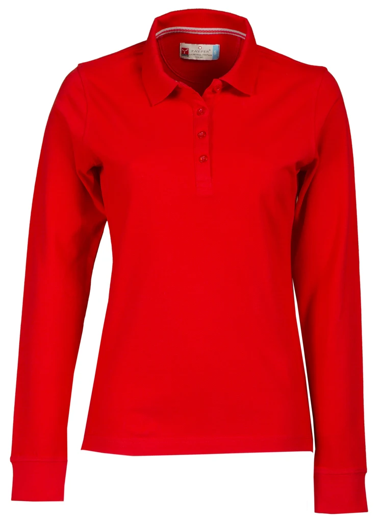 Tailliertes Damen-Polo-Shirt, langärmelig, mit 4 Knöpfen Ton-in-Ton mit Perlmutteffekt, Kragen und Ärmelrand aus Feinripp, Seitenschlitzen, Nackenband in Kontrastfarbe, Stretchnähten, seitlichem Verstärkungsband, Nackensattel