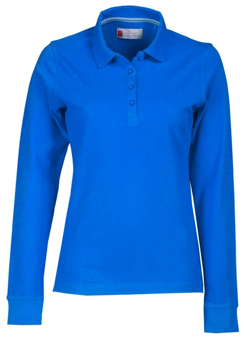 Tailliertes Damen-Polo-Shirt, langärmelig, mit 4 Knöpfen Ton-in-Ton mit Perlmutteffekt, Kragen und Ärmelrand aus Feinripp, Seitenschlitzen, Nackenband in Kontrastfarbe, Stretchnähten, seitlichem Verstärkungsband, Nackensattel