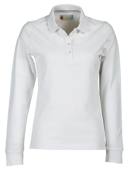 Tailliertes Damen-Polo-Shirt, langärmelig, mit 4 Knöpfen Ton-in-Ton mit Perlmutteffekt, Kragen und Ärmelrand aus Feinripp, Seitenschlitzen, Nackenband in Kontrastfarbe, Stretchnähten, seitlichem Verstärkungsband, Nackensattel