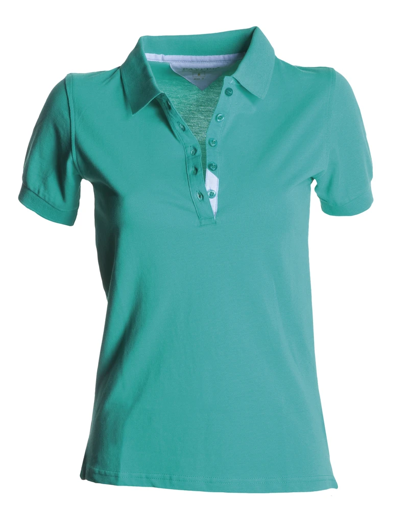 Tailliertes Damen-Polo-Shirt, kurzärmelig, mit 5 Knöpfen Ton-in-Ton mit Perlmutteffekt, Kragen und Ärmelrand aus Feinripp, dezenten, hellblauen Popeline-Einsätzen an der Krageninnenseite, Knopfleiste und an den Seitenschlitzen, Transfer-Etikett, Nackensattel
