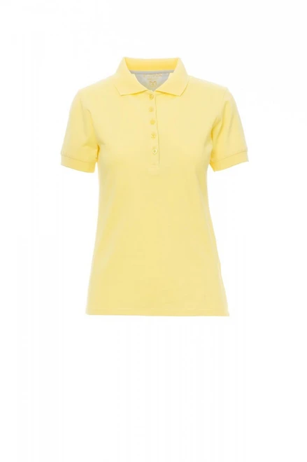 Tailliertes Damen-Polo-Shirt, kurzärmelig, mit 5 Knöpfen Ton-in-Ton mit Perlmutteffekt, Kragen und Ärmelrand aus Feinripp, dezenten, hellblauen Popeline-Einsätzen an der Krageninnenseite, Knopfleiste und an den Seitenschlitzen, Transfer-Etikett, Nackensattel