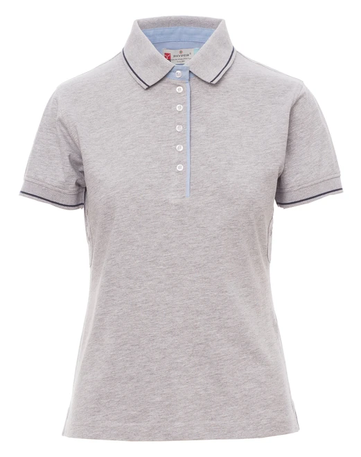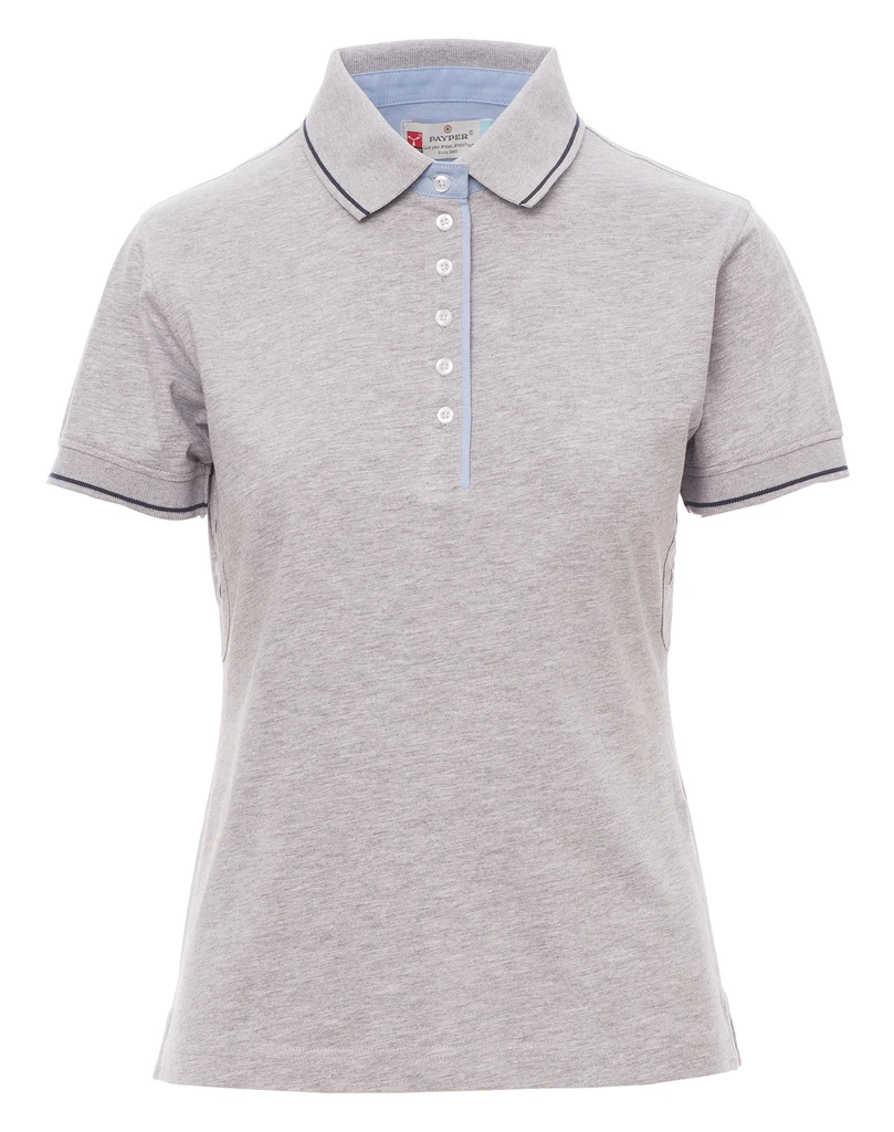 Tailliertes Damen-Polo-Shirt, kurzärmelig, mit sechs weißen Knöpfen, Innenseite des Kragens, der