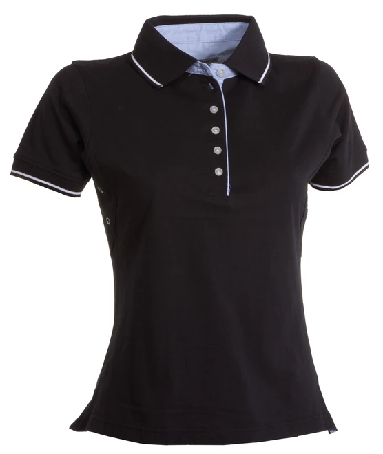 Tailliertes Damen-Polo-Shirt, kurzärmelig, mit sechs weißen Knöpfen, Innenseite des Kragens, der