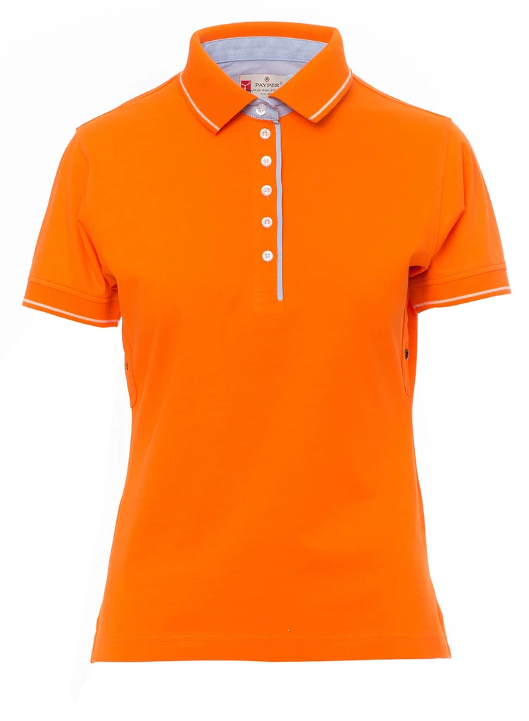 Tailliertes Damen-Polo-Shirt, kurzärmelig, mit sechs weißen Knöpfen, Innenseite des Kragens, der
