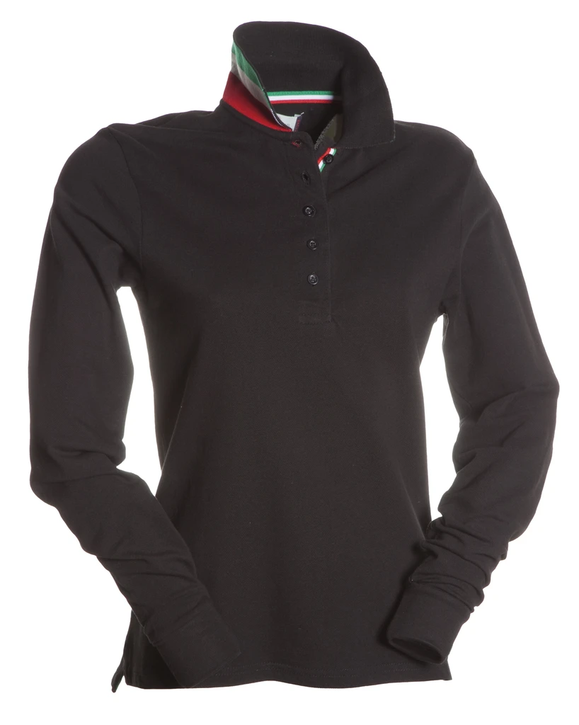 Langärmliges Damen Poloshirt mit 5 passenden Perlmutt-Effektknöpfen, passendem Kragen, mit kontrastierender Unterseite (Farben der Flagge). Innere Knopfleiste und Seitenschlitze mit Farben der Flagge, Rippkragen und Manschetten, verdeckte Kragennähte, Seitenverstärkungsband