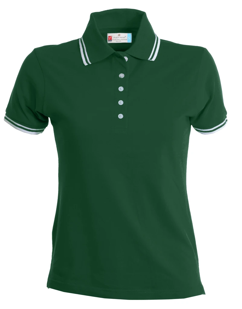 Tailliertes Damen-Polo-Shirt, kurzärmelig, mit 5 weißen Knöpfen, Kragen und Ärmelrand mit feiner kontrastfarbiger Einfassung, Kragen und Ärmelrand aus Feinripp, Seitenschlitzen mit Verstärkungsnaht, Nackenband, seitlichem Verstärkungsband, Stretchnähten, Nackensattel