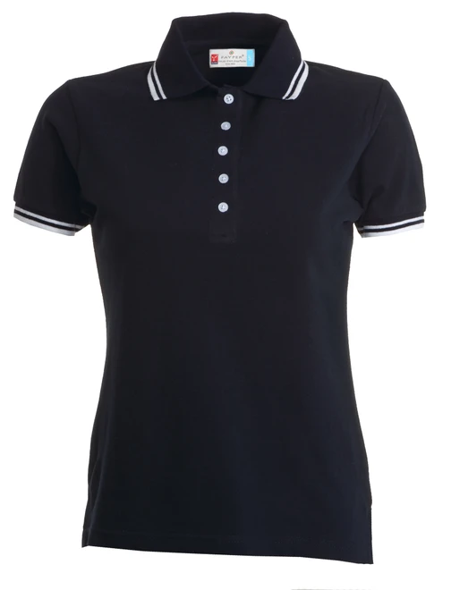 Tailliertes Damen-Polo-Shirt, kurzärmelig, mit 5 weißen Knöpfen, Kragen und Ärmelrand mit feiner kontrastfarbiger Einfassung, Kragen und Ärmelrand aus Feinripp, Seitenschlitzen mit Verstärkungsnaht, Nackenband, seitlichem Verstärkungsband, Stretchnähten, Nackensattel
