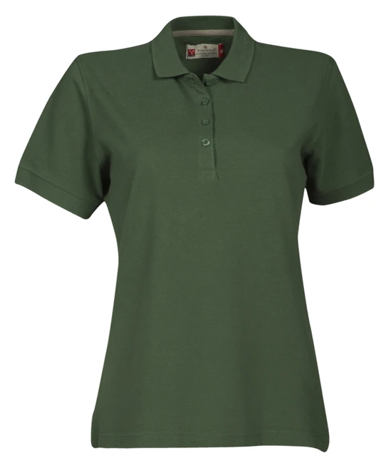 Tailliertes Damen-Polo-Shirt, kurzärmelig, mit 4 Knöpfen Ton-in-Ton mit Perlmutteffekt, Kragen und Ärmelrand aus Feinripp, Seitenschlitzen, Nackenband in Kontrastfarbe, Stretchnähten, seitlichem Verstärkungsband, Nackensattel