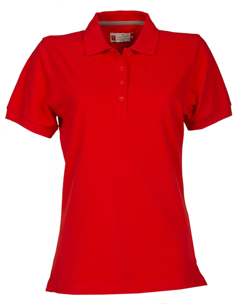 Tailliertes Damen-Polo-Shirt, kurzärmelig, mit 4 Knöpfen Ton-in-Ton mit Perlmutteffekt, Kragen und Ärmelrand aus Feinripp, Seitenschlitzen, Nackenband in Kontrastfarbe, Stretchnähten, seitlichem Verstärkungsband, Nackensattel