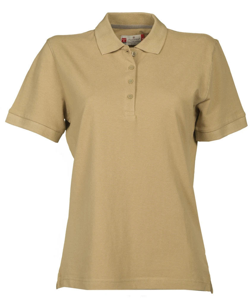 Tailliertes Damen-Polo-Shirt, kurzärmelig, mit 4 Knöpfen Ton-in-Ton mit Perlmutteffekt, Kragen und Ärmelrand aus Feinripp, Seitenschlitzen, Nackenband in Kontrastfarbe, Stretchnähten, seitlichem Verstärkungsband, Nackensattel