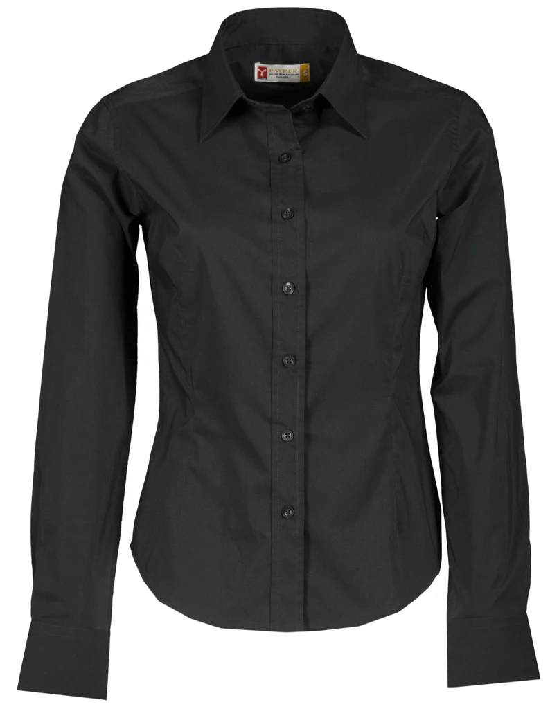 Damenbluse aus feinster gekämmter Baumwolle, körpernah geschnitten, mit Abnähern vorn und hinten, Kragen im italienischen Design, geformten Manschetten mit 2 Knöpfen und einem Knopfloch, sichtbarer Knopfleiste und Knöpf