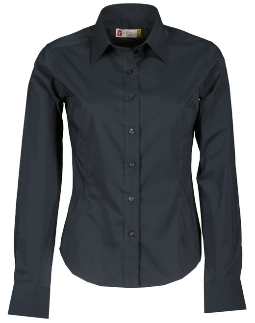 Damenbluse aus feinster gekämmter Baumwolle, körpernah geschnitten, mit Abnähern vorn und hinten, Kragen im italienischen Design, geformten Manschetten mit 2 Knöpfen und einem Knopfloch, sichtbarer Knopfleiste und Knöpf