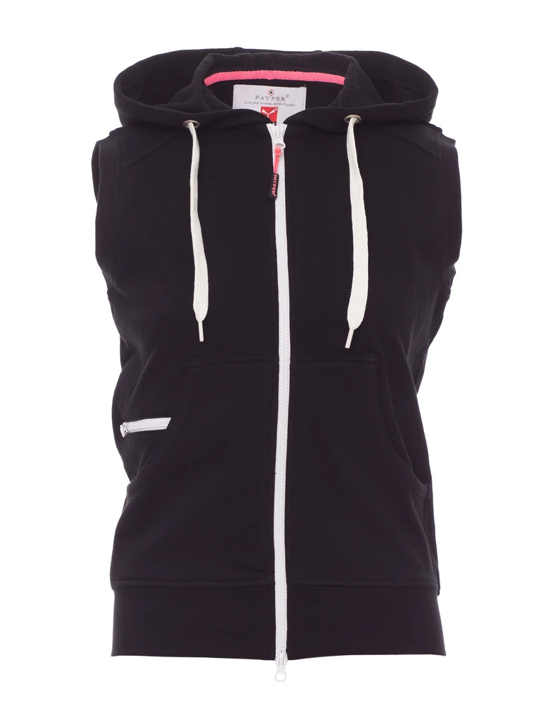 Women's ärmelloser Hoodie, vollplastischer Reißverschluss in Kontrastfarbe mit Doppel-Metall-Zug, geformte Kapuze und Kordelzug in Kontrastfarbe, Kängurutasche mit kleiner Tasche mit Reißverschluss