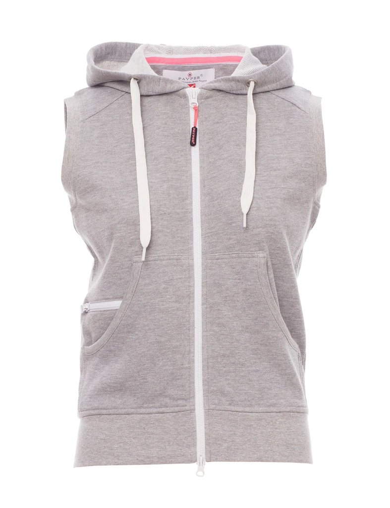 Women's ärmelloser Hoodie, vollplastischer Reißverschluss in Kontrastfarbe mit Doppel-Metall-Zug, geformte Kapuze und Kordelzug in Kontrastfarbe, Kängurutasche mit kleiner Tasche mit Reißverschluss