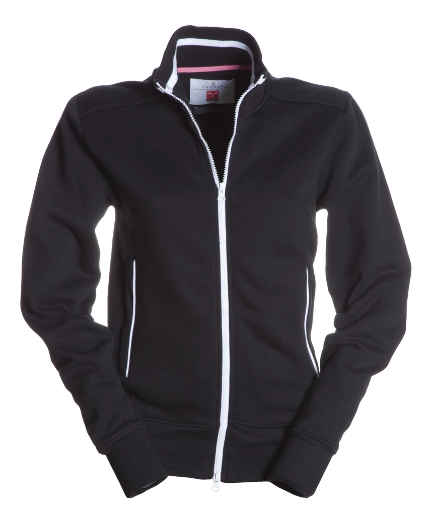 Taillierte Damen-Sweatjacke mit durchgehendem 2-Wege-SBS-Reißverschluss aus Kunststoff in Kontrastfarbe mit Metallschieber, kontrastfarbiger Einfassung auf dem Rippstrickkragen und auf den Seitentaschen, Kugelärmeln, zwei Außentaschen mit Reißverschlüssen in Kontrastfarbe, elastischem Feinripp an Ärmeln und Taille, verstärkten Nähten