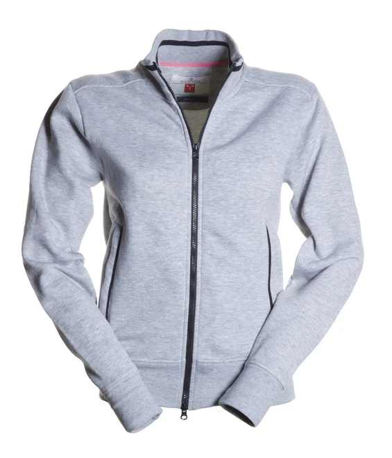 Taillierte Damen-Sweatjacke mit durchgehendem 2-Wege-SBS-Reißverschluss aus Kunststoff in Kontrastfarbe mit Metallschieber, kontrastfarbiger Einfassung auf dem Rippstrickkragen und auf den Seitentaschen, Kugelärmeln, zwei Außentaschen mit Reißverschlüssen in Kontrastfarbe, elastischem Feinripp an Ärmeln und Taille, verstärkten Nähten