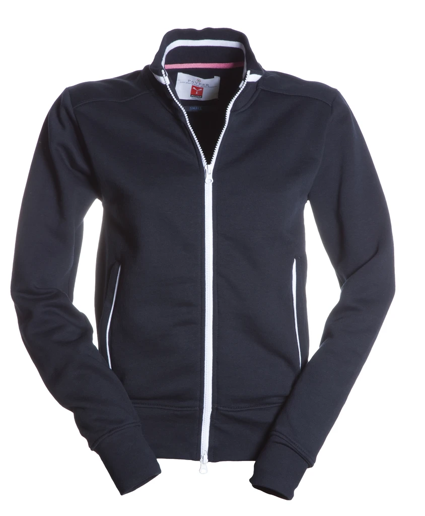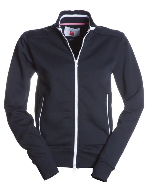 Taillierte Damen-Sweatjacke mit durchgehendem 2-Wege-SBS-Reißverschluss aus Kunststoff in Kontrastfarbe mit Metallschieber, kontrastfarbiger Einfassung auf dem Rippstrickkragen und auf den Seitentaschen, Kugelärmeln, zwei Außentaschen mit Reißverschlüssen in Kontrastfarbe, elastischem Feinripp an Ärmeln und Taille, verstärkten Nähten