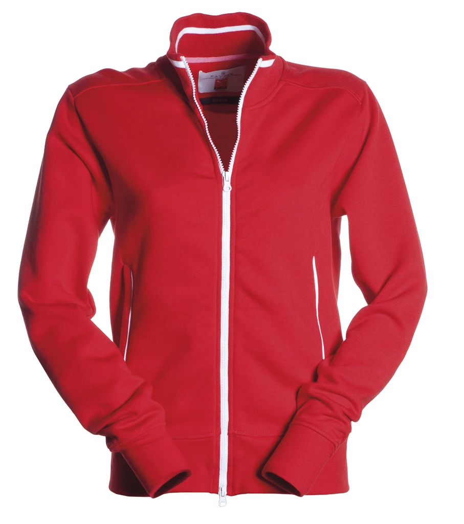Taillierte Damen-Sweatjacke mit durchgehendem 2-Wege-SBS-Reißverschluss aus Kunststoff in Kontrastfarbe mit Metallschieber, kontrastfarbiger Einfassung auf dem Rippstrickkragen und auf den Seitentaschen, Kugelärmeln, zwei Außentaschen mit Reißverschlüssen in Kontrastfarbe, elastischem Feinripp an Ärmeln und Taille, verstärkten Nähten