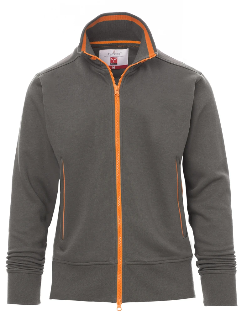 Taillierte Damen-Sweatjacke mit durchgehendem 2-Wege-SBS-Reißverschluss aus Kunststoff in Kontrastfarbe mit Metallschieber, kontrastfarbiger Einfassung auf dem Rippstrickkragen und auf den Seitentaschen, Kugelärmeln, zwei Außentaschen mit Reißverschlüssen in Kontrastfarbe, elastischem Feinripp an Ärmeln und Taille, verstärkten Nähten