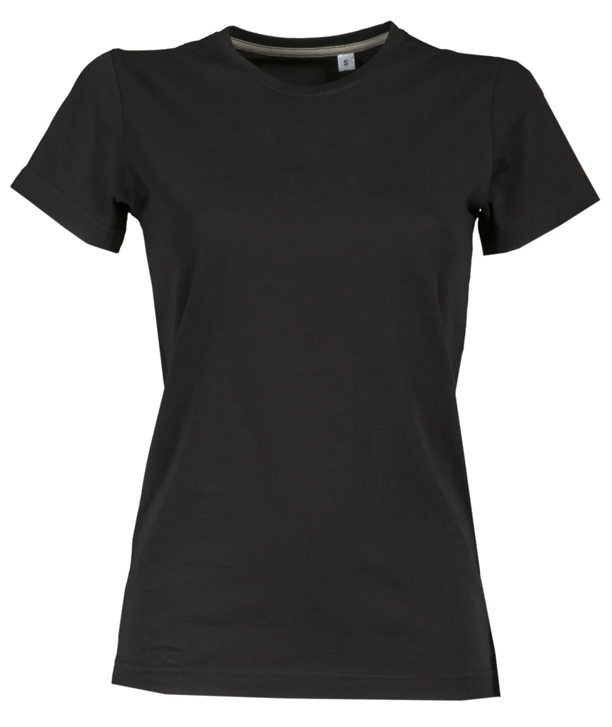Tailliertes Damen-T-Shirt mit Rundhalsausschnitt, kurzärmelig, Feinripp-Kragen 1,5 cm aus Spandex-Mischgewebe mit Kappnaht an der Vorderseite, Verstärkungsband in Kontrastfarbe