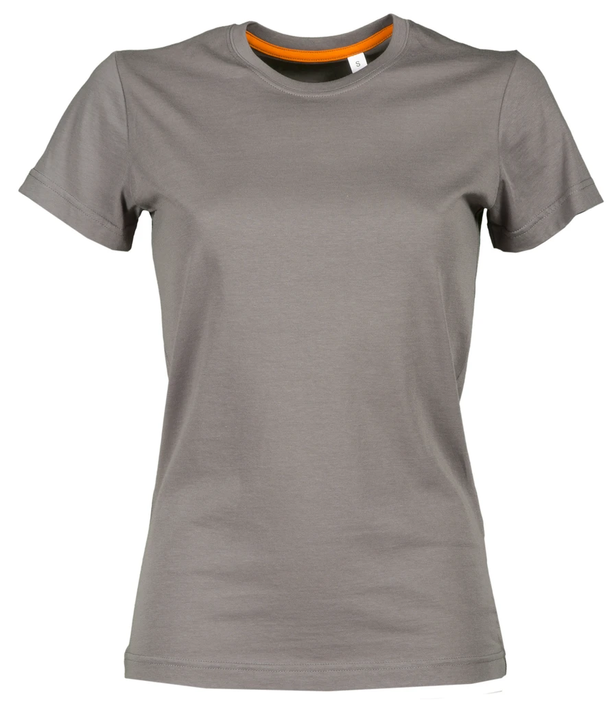 Tailliertes Damen-T-Shirt mit Rundhalsausschnitt, kurzärmelig, Feinripp-Kragen 1,5 cm aus Spandex-Mischgewebe mit Kappnaht an der Vorderseite, Verstärkungsband in Kontrastfarbe