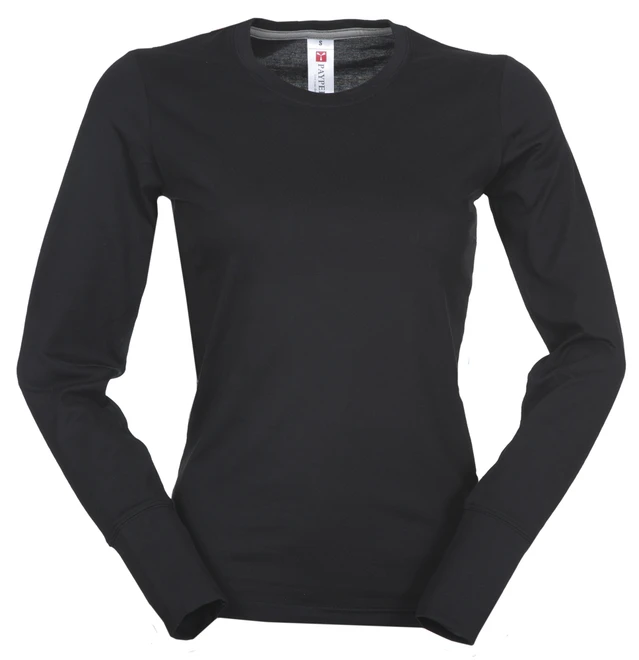 Tailliertes Damen-T-Shirt mit Rundhalsausschnitt, langärmelig, Feinripp-Kragen 1,5 cm aus Spandex-Mischgewebe mit Kappnaht an der Vorderseite, langen Ärmelbündchen, Verstärkungsband in Kontrastfarbe von Schulter zu Schulter, das im Kragen sichtbar ist, Stretchnähten, Seitennaht