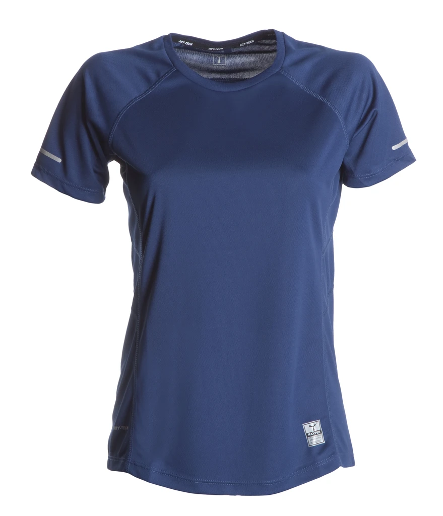 Sportlich-technisches, tailliertes Damen-T-Shirt, kurzärmelig, mit Raglanärmeln, doppelter Seitennaht für eine gute Passform, unten eng anliegend und hinten länger geschnitten, mit reflektierendem Einsatz an den Ärmeln und am Nacken, Nackenband in Kontrastfarbe, Transfer-Etikett
