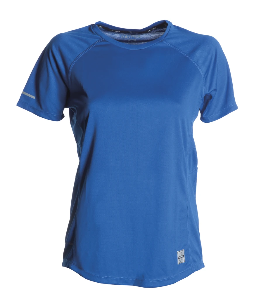 Sportlich-technisches, tailliertes Damen-T-Shirt, kurzärmelig, mit Raglanärmeln, doppelter Seitennaht für eine gute Passform, unten eng anliegend und hinten länger geschnitten, mit reflektierendem Einsatz an den Ärmeln und am Nacken, Nackenband in Kontrastfarbe, Transfer-Etikett