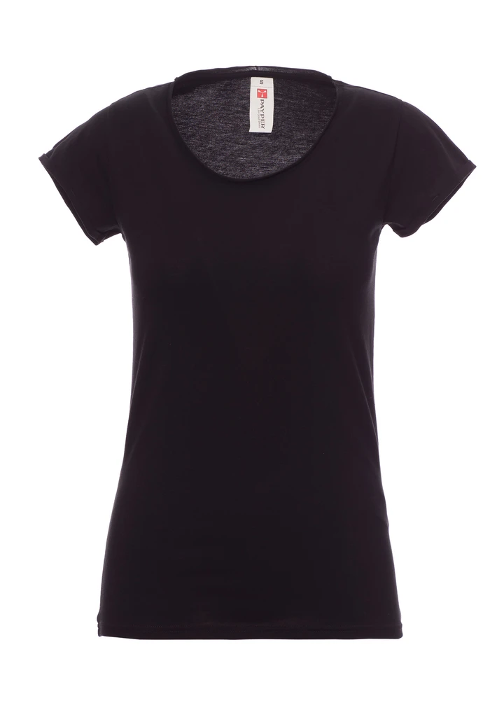 Tailliertes Damen-T-Shirt, kurzärmelig, mit tiefem, offenkantigem V-Ausschnitt, Innen-Doppelnaht an den Schultern, Ärmeln mit schmalem, offenkantigem Aufschlag, Seitennaht, Transfer-Etikett