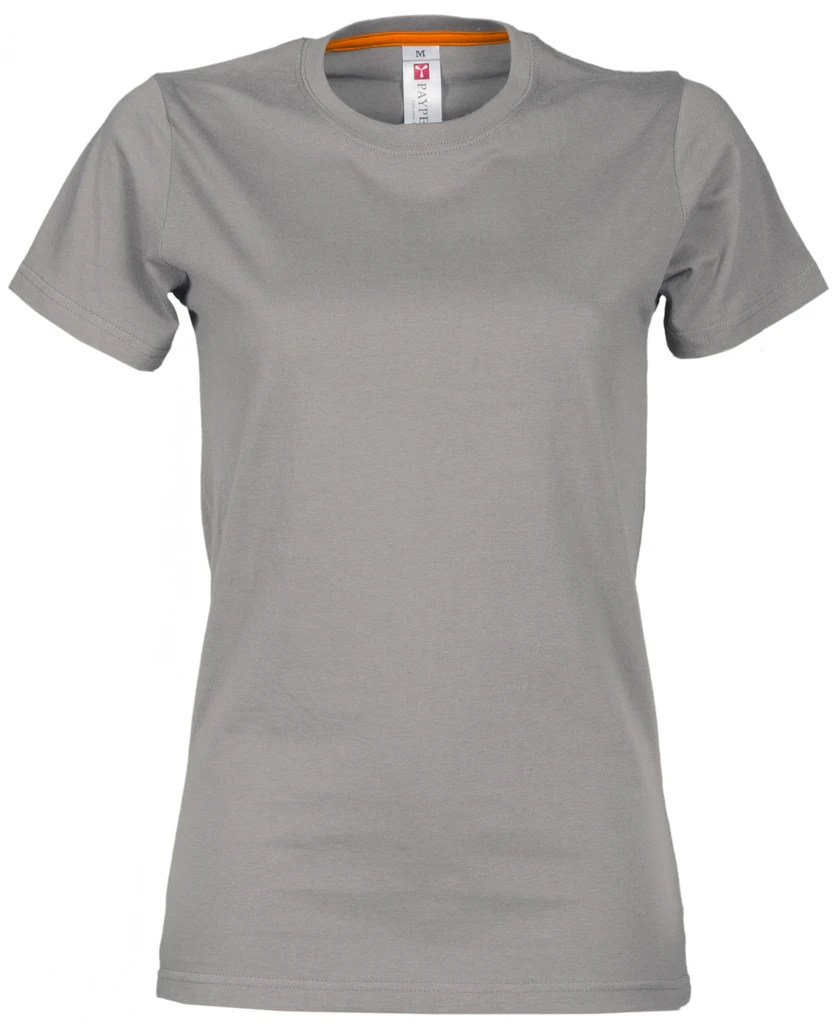 Tailliertes Damen-T-Shirt mit Rundhalsausschnitt, kurzärmelig, Feinripp-Kragen 1,5 cm aus Spandex-Mischgewebe mit Kappnaht an der Vorderseite, Verstärkungsband in Kontrastfarbe von Schulter zu Schulter, das im Kragen sichtbar ist, Stretchnähten, Seitennaht